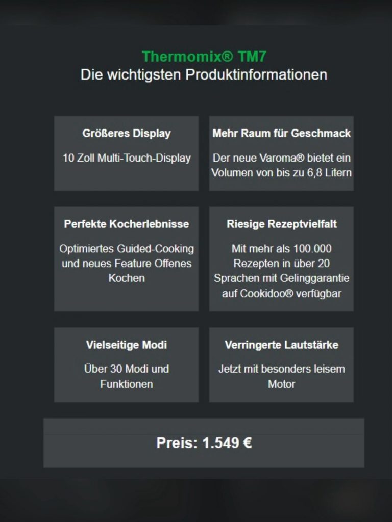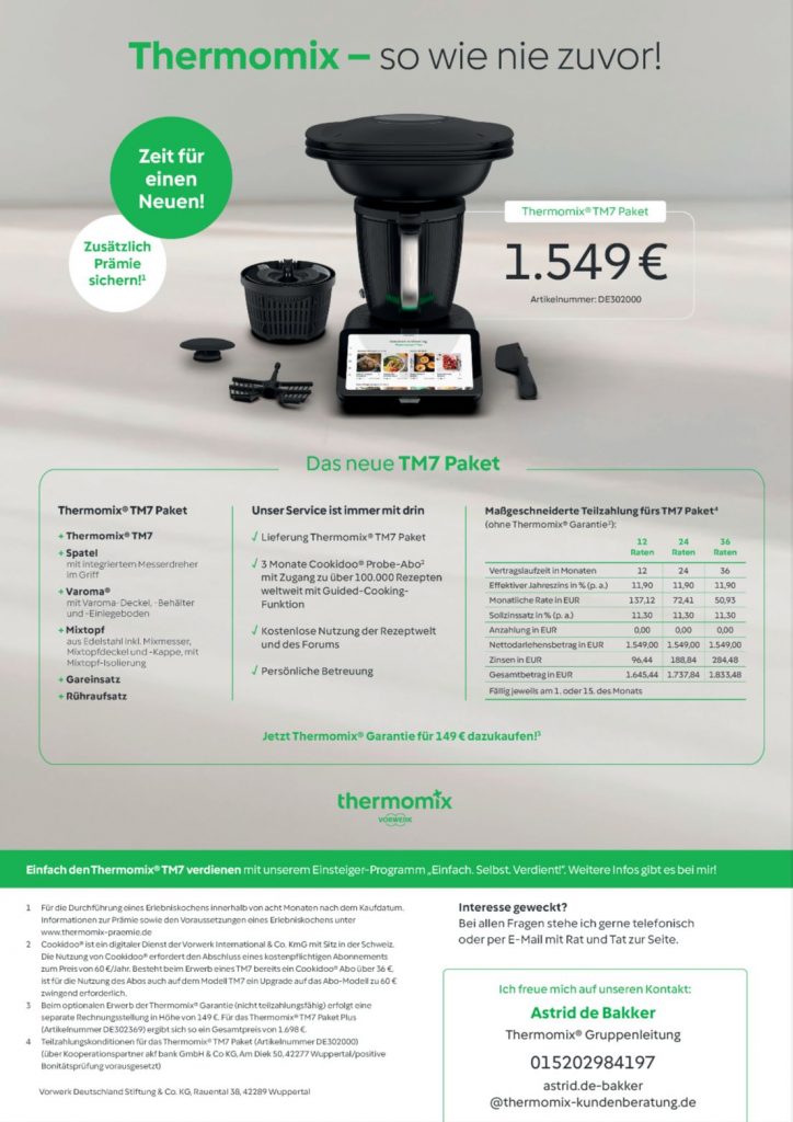 Wenn Du den Thermomix TM7 mit seinen neuen Funktionen gerne Kennenlernen möchtest, zeige ich Dir natürlich völlig unverbindlich, welche große Erleichterung der Thermomix® in Deiner Küche sein kann.